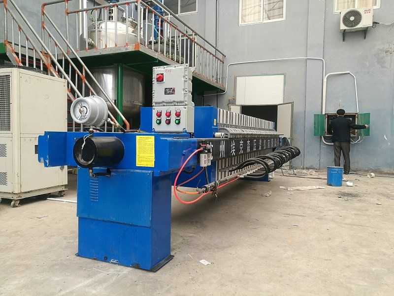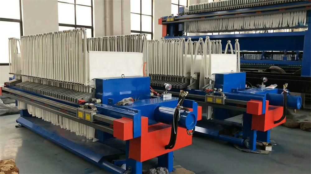 液壓廂式壓濾機由交替排列的濾板和濾框構成一組濾室。濾板的表面有溝槽,其凸出部位用以支撐濾布。濾框和濾板的邊角上有通孔,組裝后構成完整的通道,能通入懸浮液、洗滌水和引出濾液。板、框兩側各有把手支托在橫梁上,由壓緊裝置壓緊板、框。板、框之間的濾布起密封墊片的作用。由供料泵將懸浮液壓入濾室 在濾布上形成濾渣,直至充滿濾室。濾液穿過濾布并沿濾板溝槽流至板框邊角通道,集中排出。過濾完畢,可通入清洗滌水洗滌濾渣。