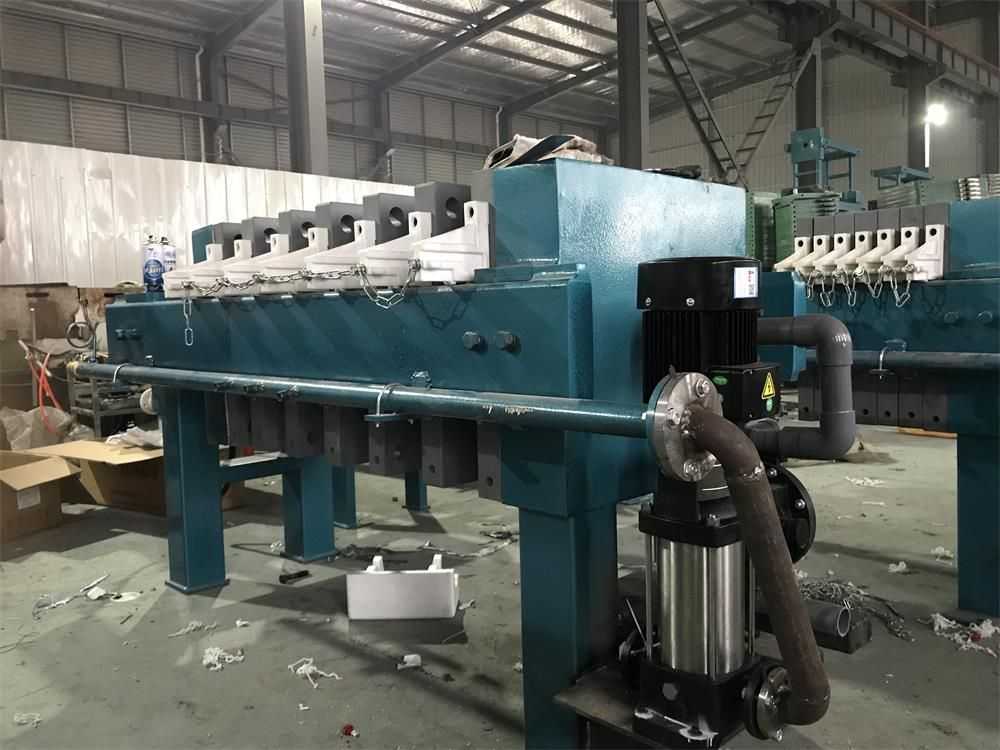 泵機一體式板框壓濾機,是進料泵和壓濾機直接管道連接好的便捷壓濾機。優(yōu)點是客戶安裝方便,節(jié)省現場空間,過濾速度快、泥餅含水率低。