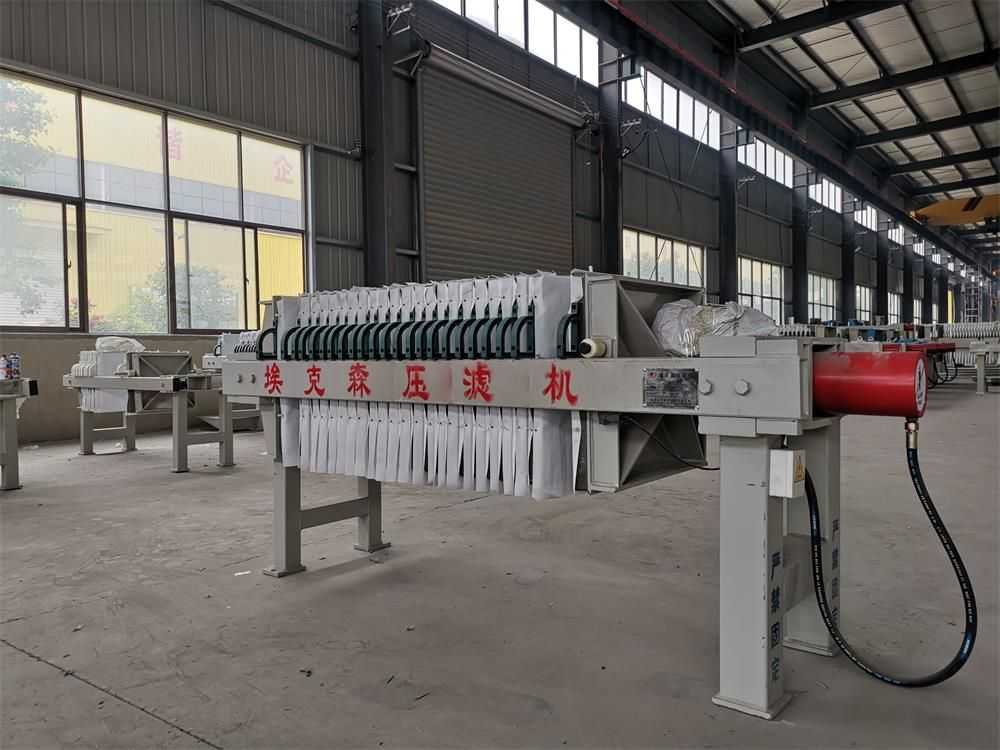 隔膜壓榨壓濾機是由隔膜板和廂式濾板排列組成濾室,在輸料泵的壓力作用下將料漿輸入濾室,通過過濾介質(濾布)將料漿中的固體和液體分離,當料漿中的固體形成餅后,再向隔膜通入空氣,對濾室內的固體充分壓榨。